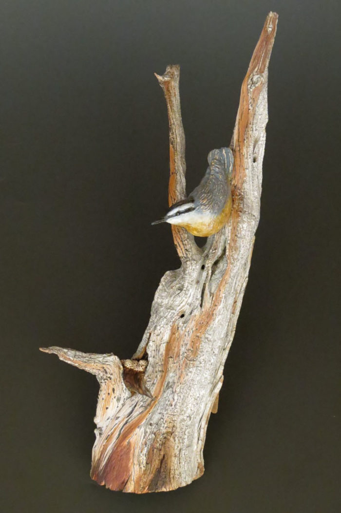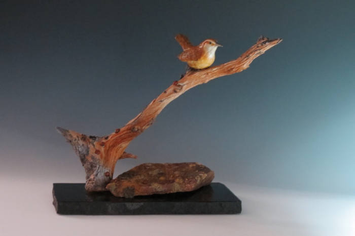SOLD Mixed: Bronze wren and lady bugs mounted on ancient bristlecone pine with a lichen-covered alpine rock. Mounted on a black granite base. Dimensions: 10”H x 11”W x 5”D All of Mother Nature’s best elements come together in this sculpture. A beautiful colored small wren sits atop a 1,500 year old weathered bristlecone pine branch.…