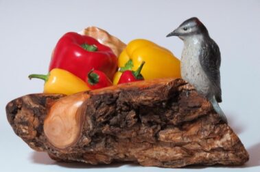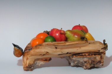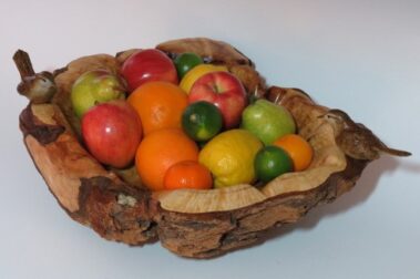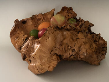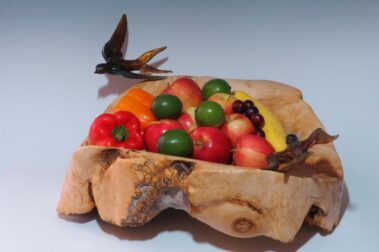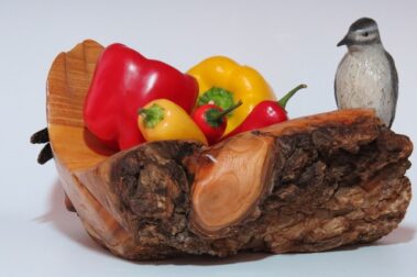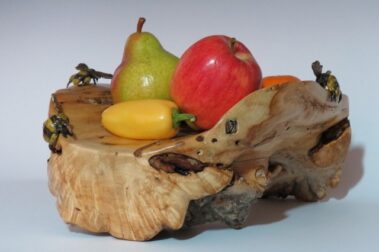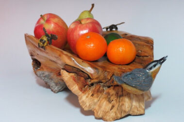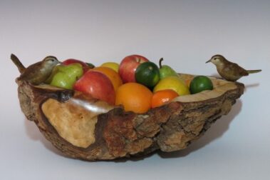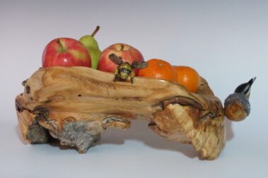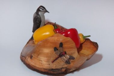 Red streaked cottonwood burl bowl with bronze nuthatch, sunflower seeds and bumblebees.