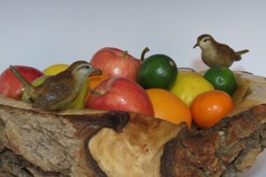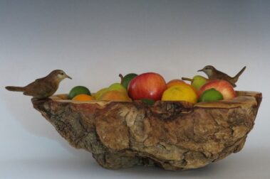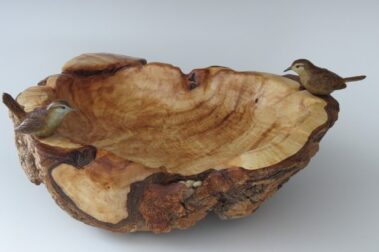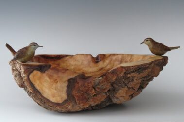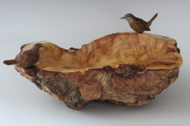 Walnut burl wood & bark bowl with a mating pair of wrens with their eggs.
