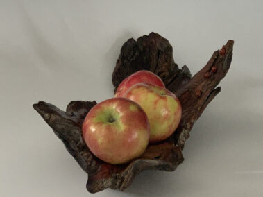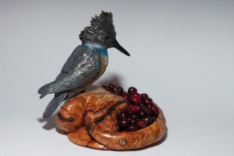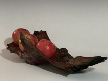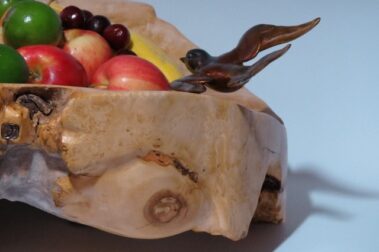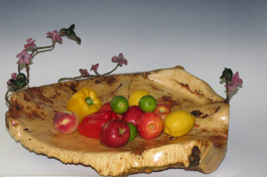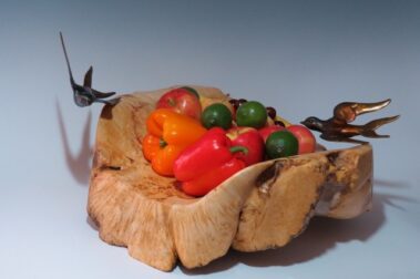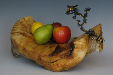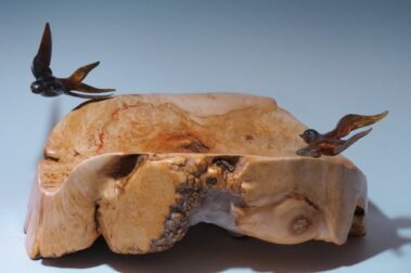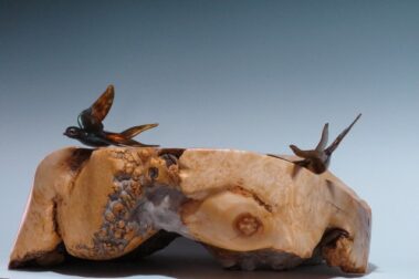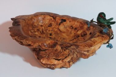 Red streaked cottonwood burl bowl with bronze barn swallows.