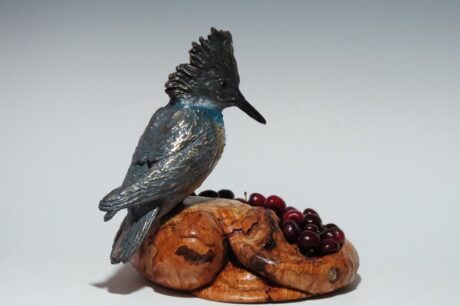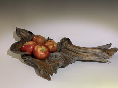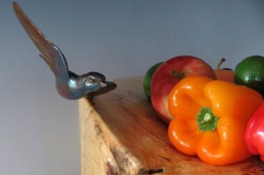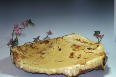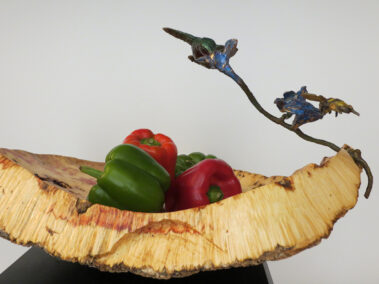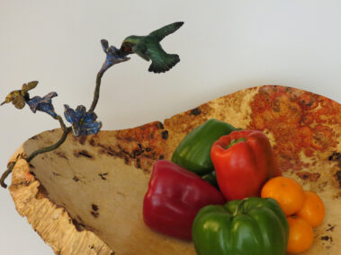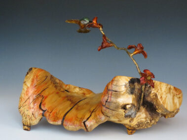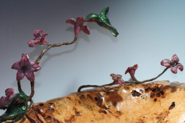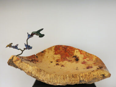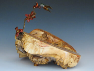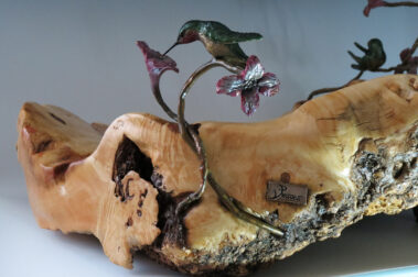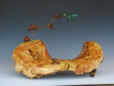 Red streaked cottonwood burl with bronze hummingbird and trumpet flowers.