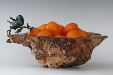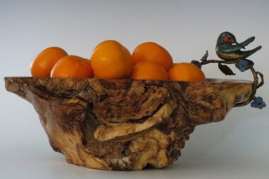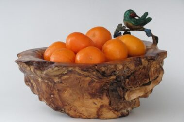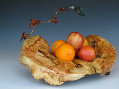 Unknown burl wood bowl with a bronze ruby red throated hummingbird in a preening pose sitting on top of a bronze stem with leaves and tiny flowers.
