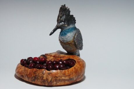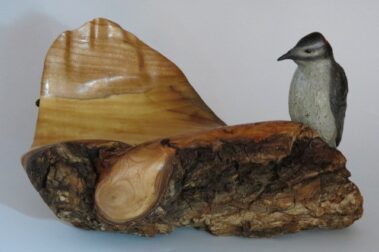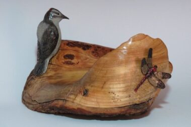 Unknown burl wood & bark bowl with a bronze downy woodpecker and dragonfly.