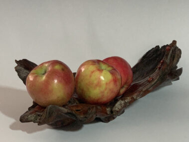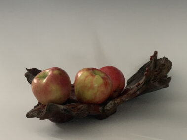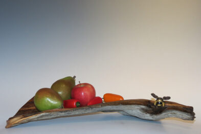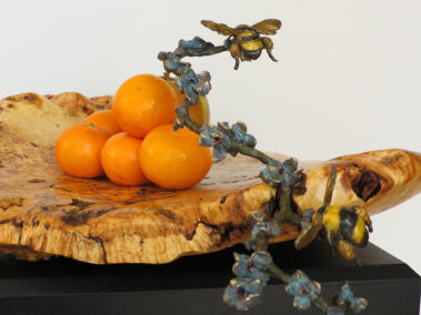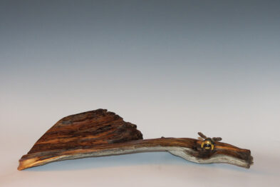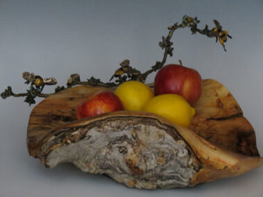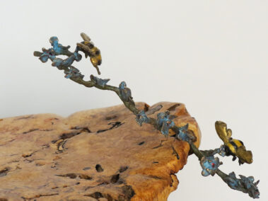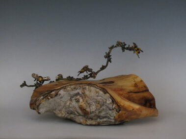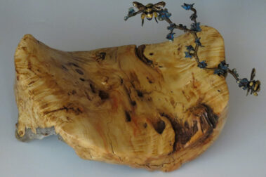 Red streaked cottonwood burl with bronze bumble bees and flowers.