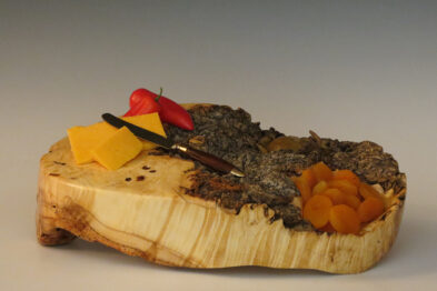 Red streaked cottonwood burl with some bark left on with bronze mouse (shape – platter style).