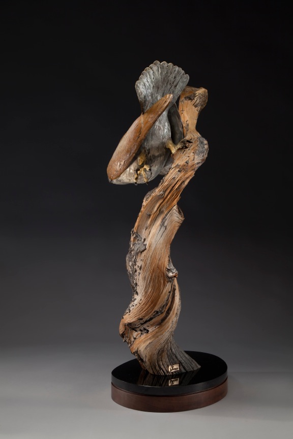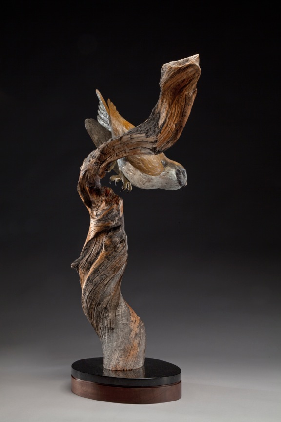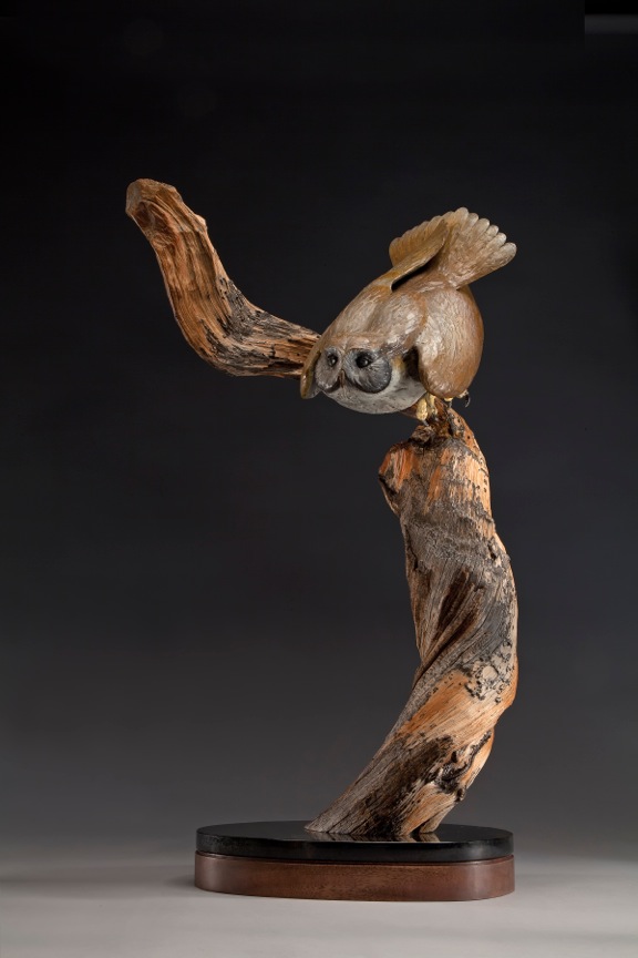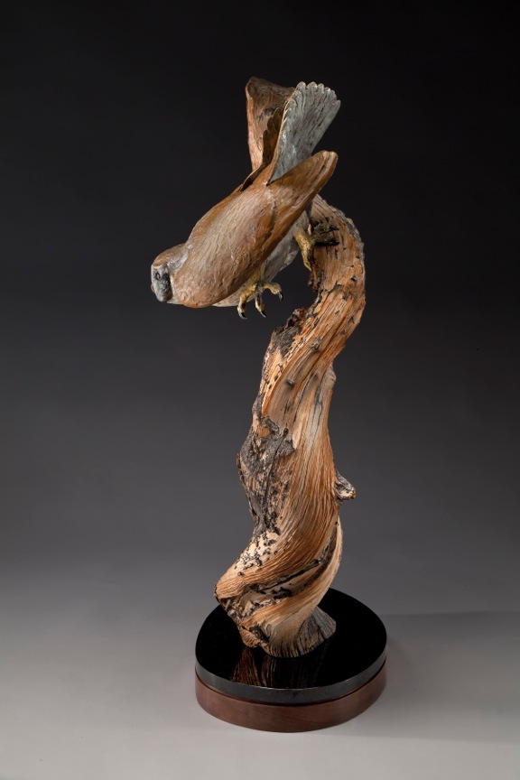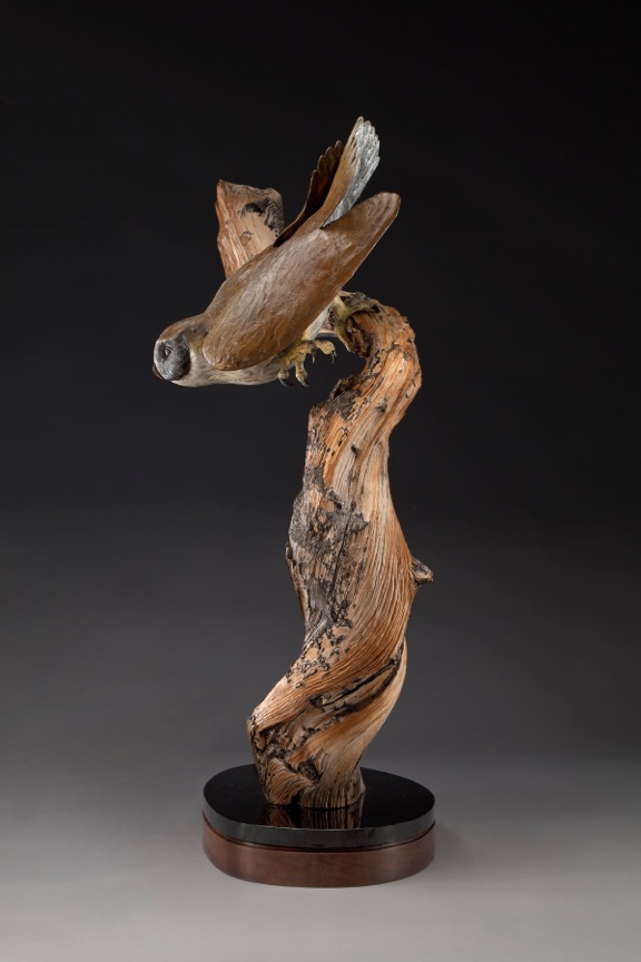 Bronze Northern Hawk Owl on rare and ancient bristlecone pine. Mounted on a black granite and mahogany wood base.