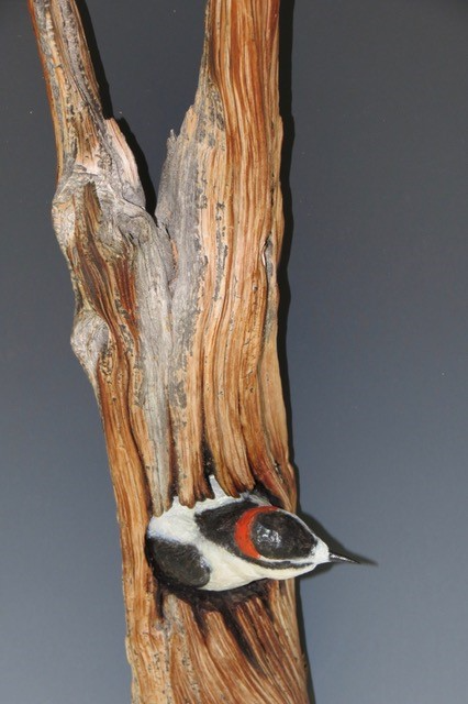 All of us bird lovers long to view what we rarely get to see in the wild. This sculpture is one of those split second views of a Downey woodpecker leaving the nesting cavity. Don’t blink!
