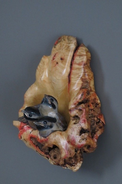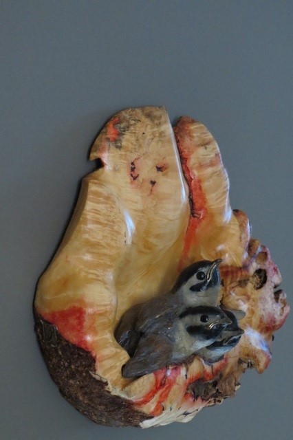 Three bronze baby chickadees in a red streaked cottonwood burl with bark inclusions. Have the fledglings spotted in coming food from Mom and Dad? Or, is it time to fly? You decide! A wonderful sculpture to hang in a space where it’s a discovery for the viewer.