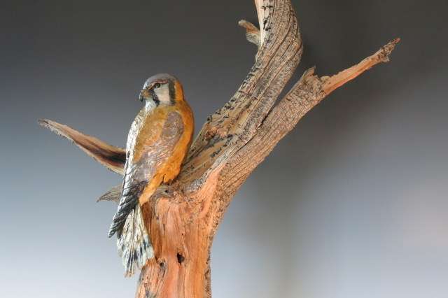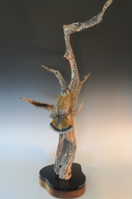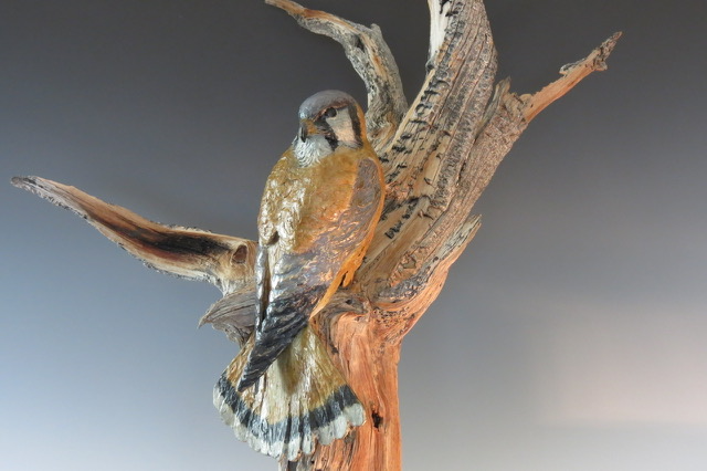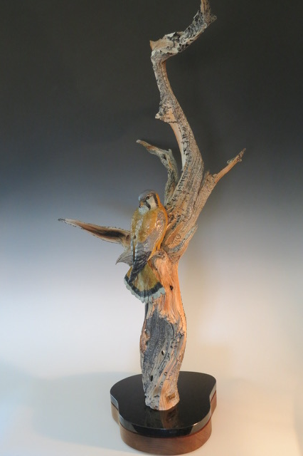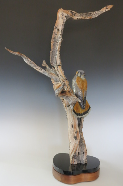 A bronze preening kestrel on lightning-struck ancient bristlecone pine. Mounted on a black granite and walnut wood.
