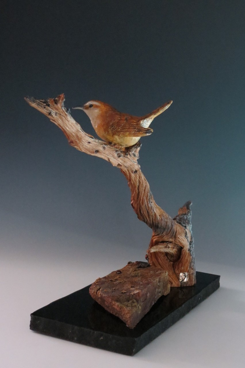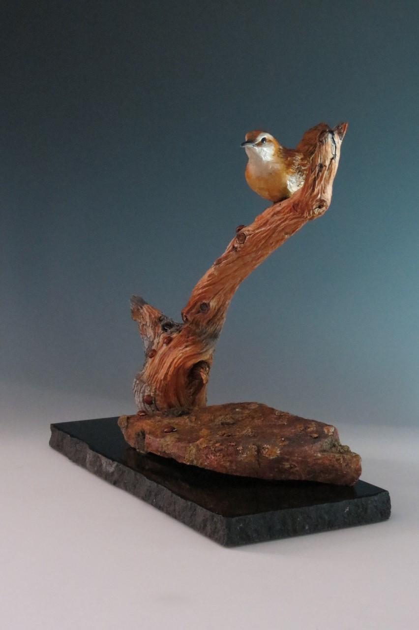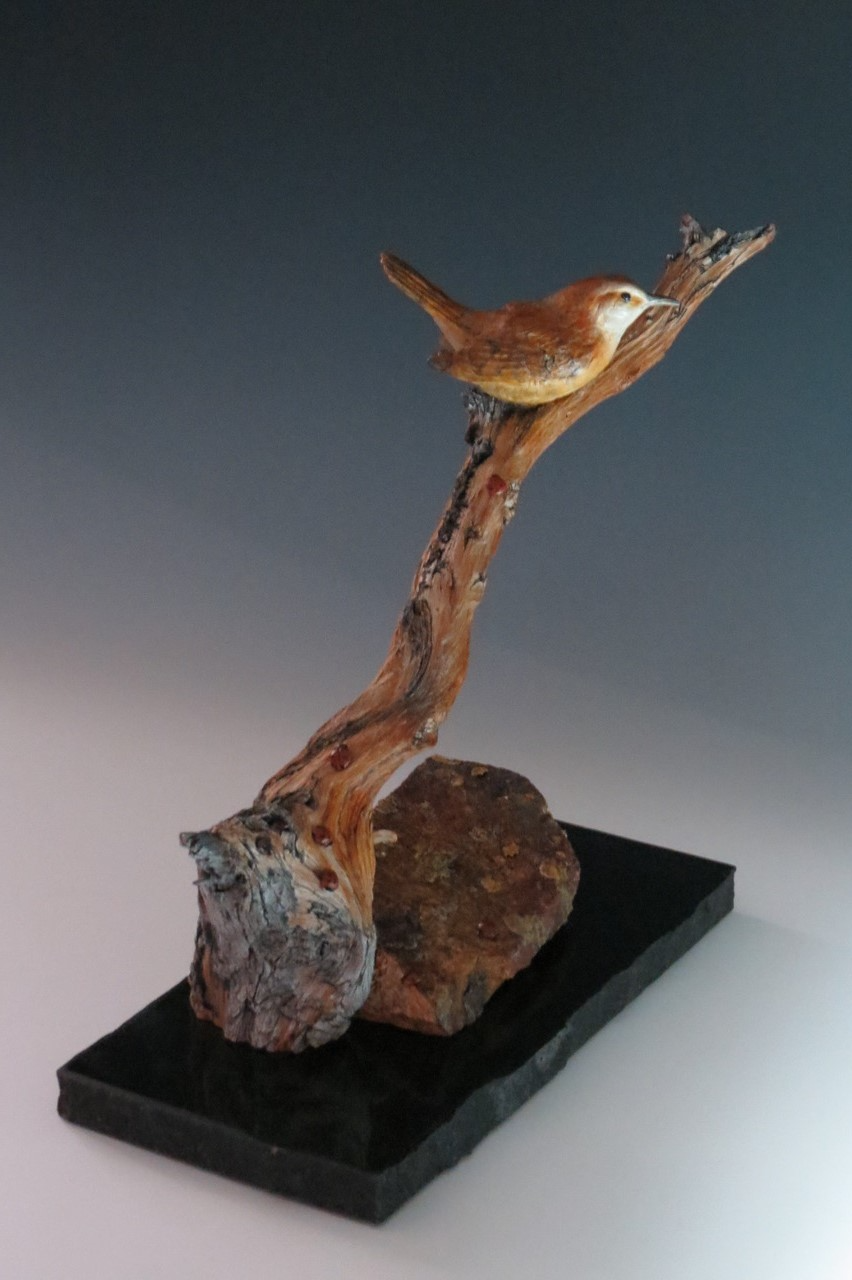 All of Mother Nature’s best elements come together in this sculpture. A beautiful colored small wren sits atop a 1,500 year old weathered bristlecone pine branch. The alpine lichen covered rock came off the mountain right where the branch was found at 11,500 ft. in the mountains.