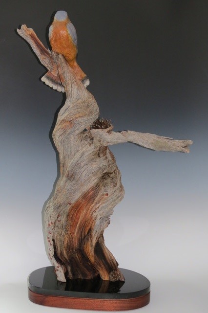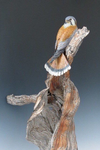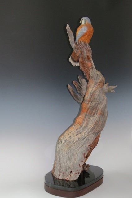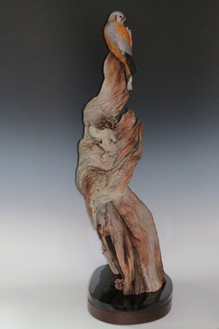 A bronze kestrel in a preening pose with lady bugs and pinecone. On ancient lightning-struck bristlecone pine. Mounted on a black granite and walnut wood base with a built in turn table.