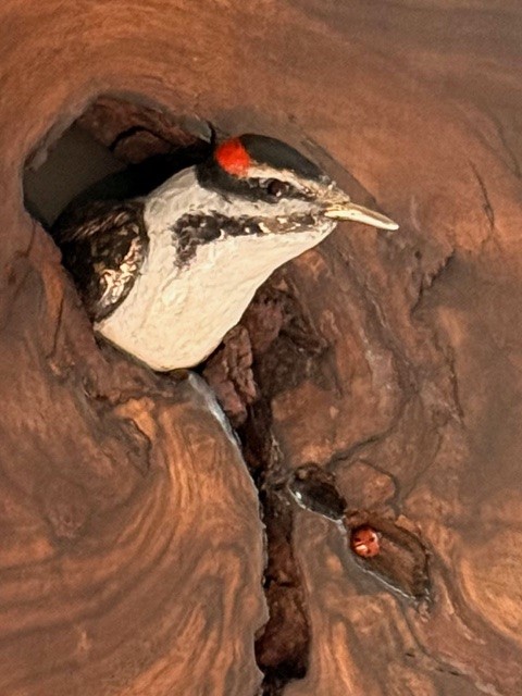 Bronze downey woodpecker and lady bugs on walnut wood with inclusions.