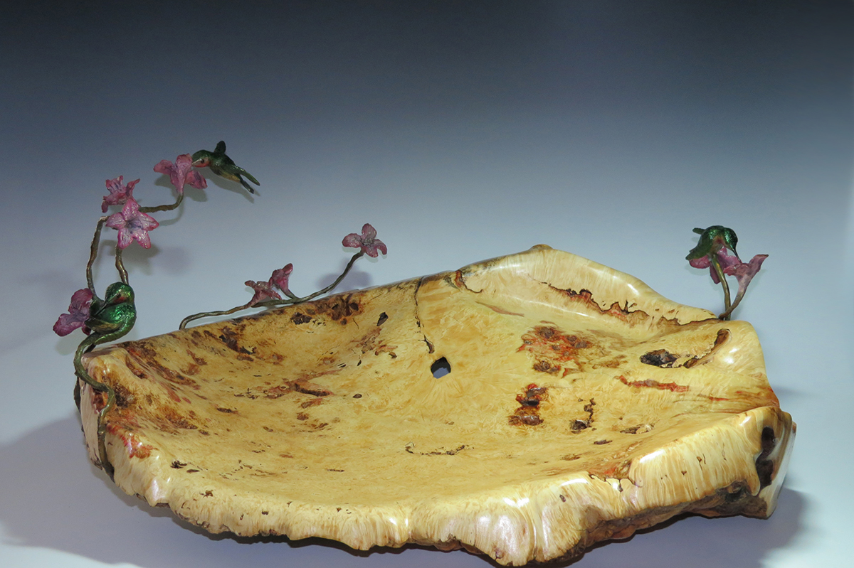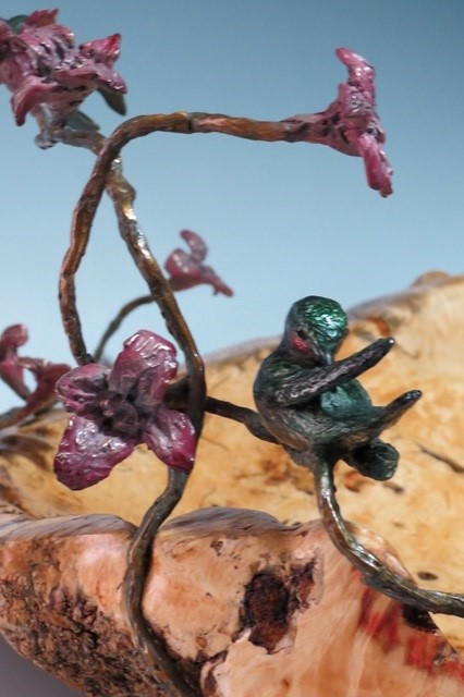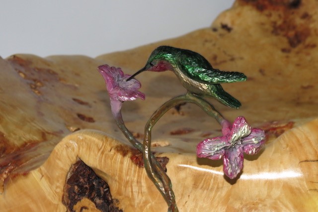 Three bronze ruby red throated hummingbirds with bronze stems of trumpet flowers and a lady bug. Mounted on a large red streaked cottonwood burl with bark on the underside of the bowl. This bowl was a commission sculpture which I created for a collector. I always enjoy collaborating with my clients so as to exactly design to their preferences. Esthetically, this sculpture/bowl is ideal for entertaining at home.