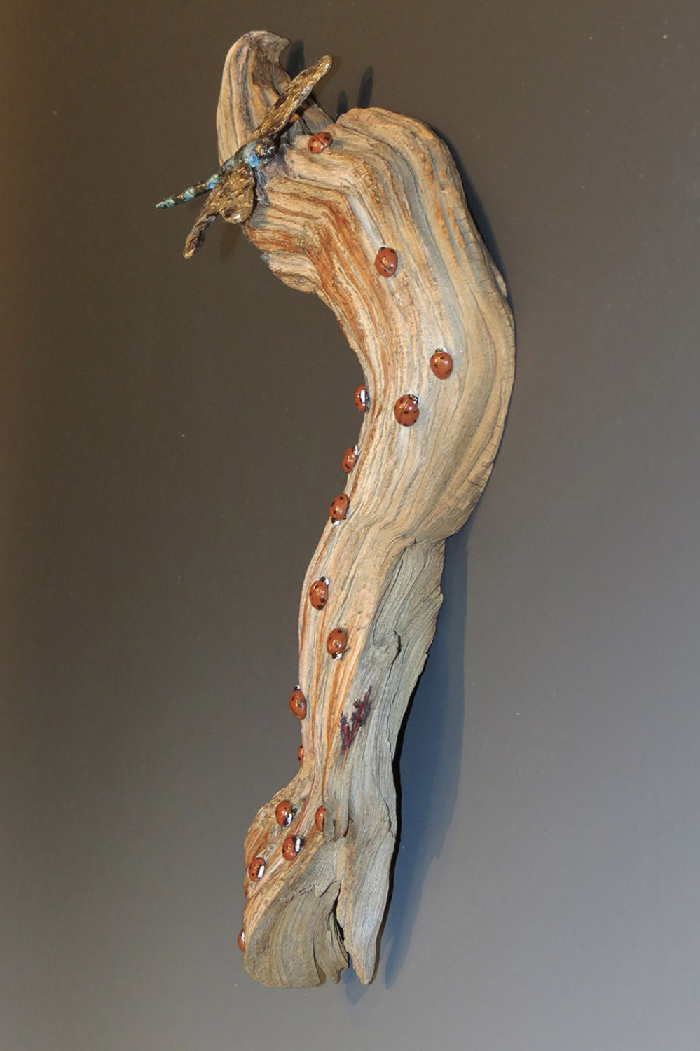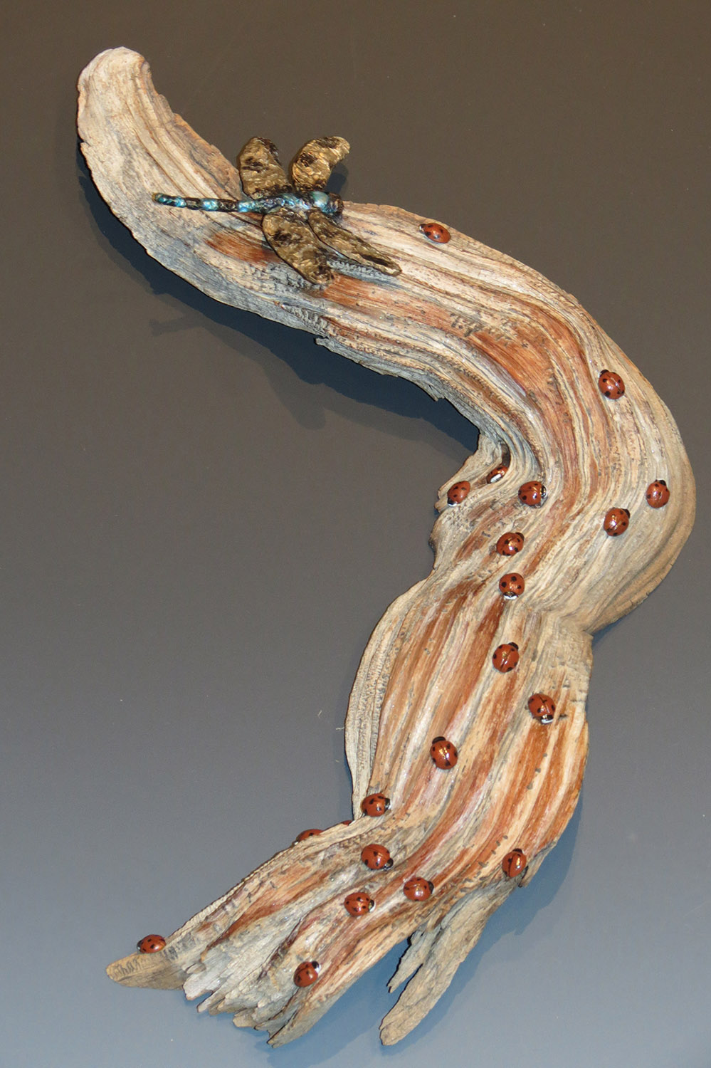 We Met One Summer Day Front#1 We met one summers day 2 We Met One Summer Day Front #3 SOLD Wall Hanging Dimensions: 13”H x 8”W x 2.25”D Bronze Ladybugs and dragonfly mounted on ancient Bristlecone Pine wood. Edition: One of a kind